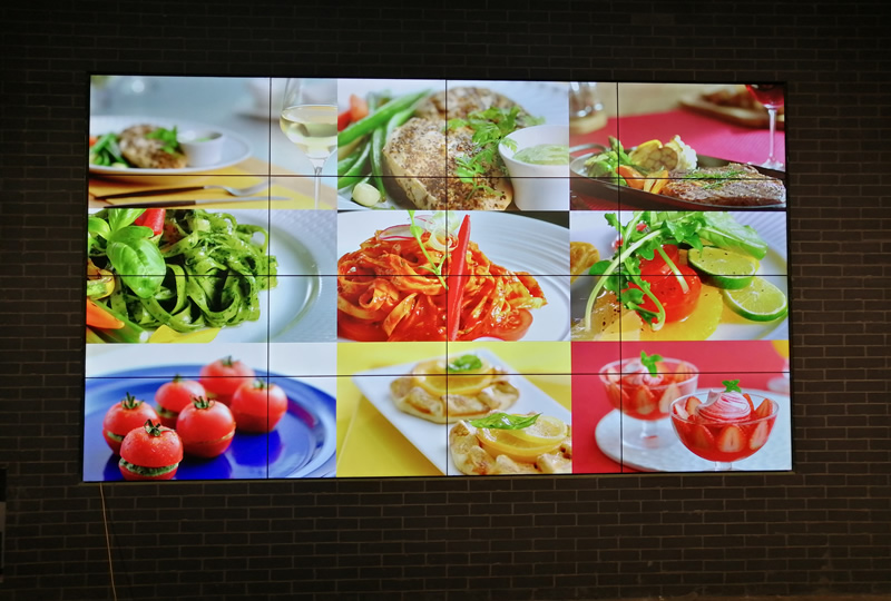 本案例中,維康國際為廣州天河某茶餐廳提供兩套顯示大屏,一套采用3x3拼接、55寸液晶拼接屏,安裝在會(huì)議室中;另一套采用4x5拼接、55寸液晶拼接屏,安裝在大廳中。這兩套大屏的屏體皆采用LG原裝面板,超窄邊設(shè)計(jì),雙邊拼縫僅有0.88mm,大屏幕拼接高清亮麗,一體化顯示效果很好,如上圖所示。