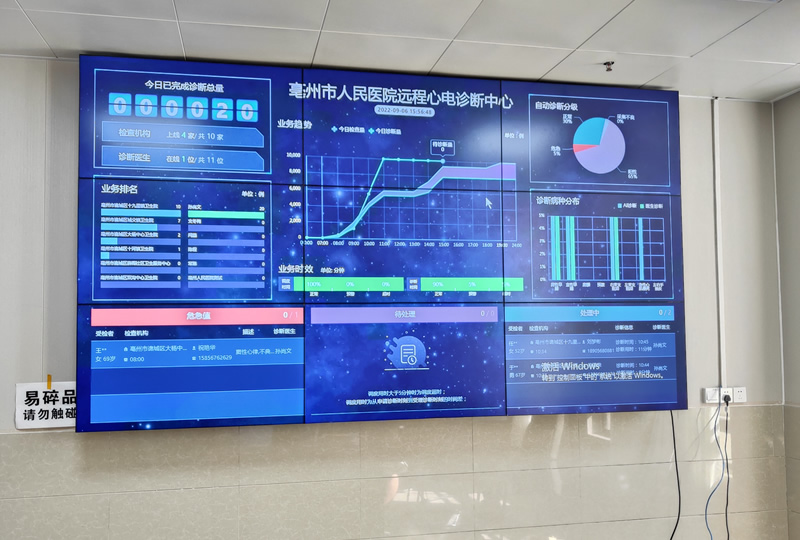 本案例中,維康國際為毫州市人民醫(yī)院提供一套大數(shù)據(jù)顯示屏,采用三行三列、46寸拼接屏,拼縫為3.5mm,壁掛式安裝。