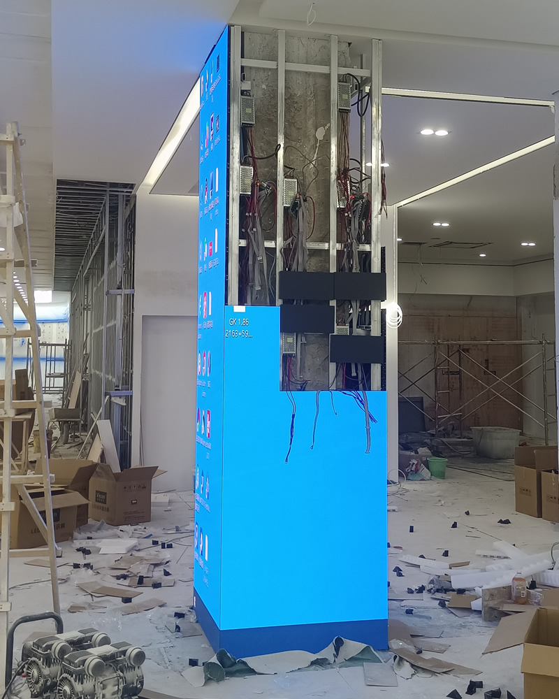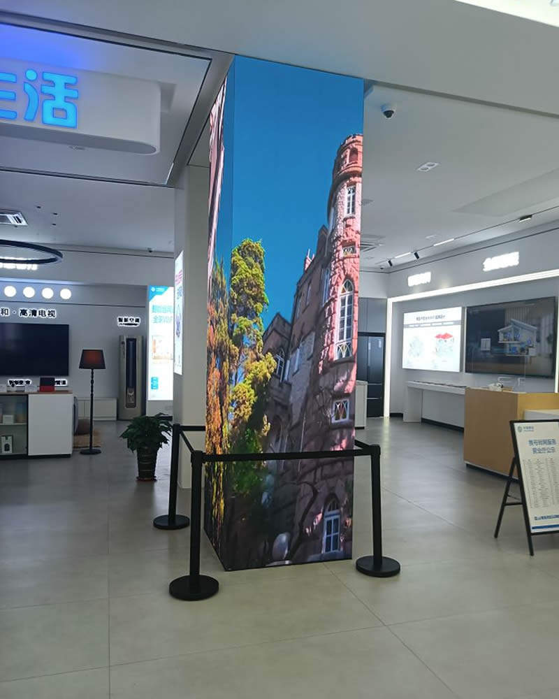 本案例中,是維康國際深圳市某營業(yè)廳提供的一套柱子LED顯示屏,畫面顯示清晰亮麗,有著很好的視覺體驗(yàn)效果。