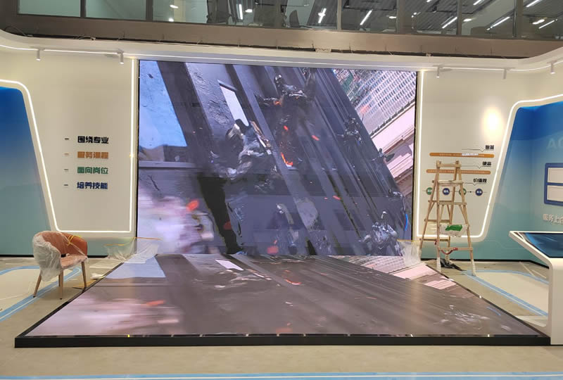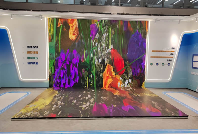本案例中,維康國際為青島市某企業(yè)展廳提供一套L型LED顯示屏,如上圖所示,地面與墻面形成90度角,大屏幕顯示清晰,3D圖像顯示效果更好。