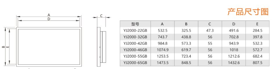 壁掛式設(shè)計(jì),尺寸為22寸~65寸,分為圓角款和直角款,并可采用橫掛和豎掛兩種安裝方式;