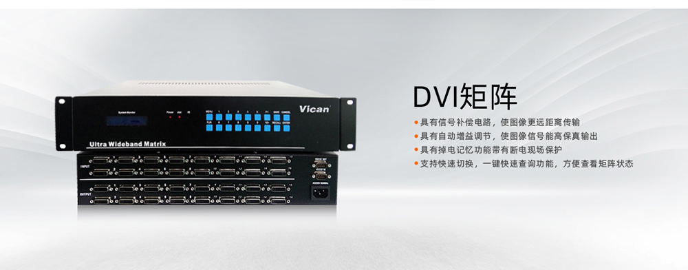 DVI矩陣JZ1000系列是專用于DVI高清2K信號輸入與輸出的控制設備,其特點與HDMI信號相同,都是高清信號控制系統(tǒng),包含4進4出、4進8出、4進16出、8進8出、8進16出等;