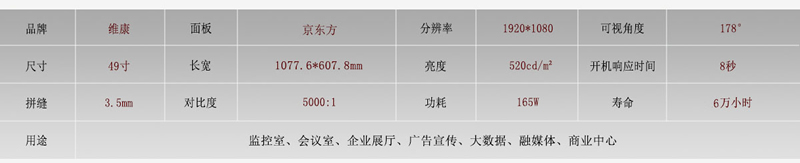 京東方49寸拼接屏是一款高性價比的工業(yè)顯示屏,拼縫規(guī)格是3.5mm,長寬尺寸為1078*608mm,也是京東方產(chǎn)品線中主要的一款,多用在視頻監(jiān)控與會議顯示中。