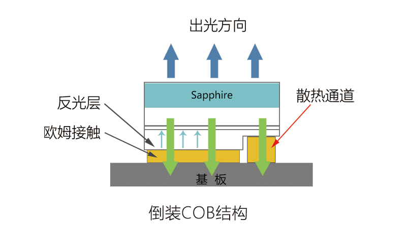 COB倒裝片技術(shù)即倒裝芯片的電極是朝下的,而且不需要正裝芯片的引線縫合焊接工藝,這樣有源層更貼近基板,縮短了熱源到基板的熱流路徑,具有較低的熱阻,可以大大提高產(chǎn)品穩(wěn)定性。